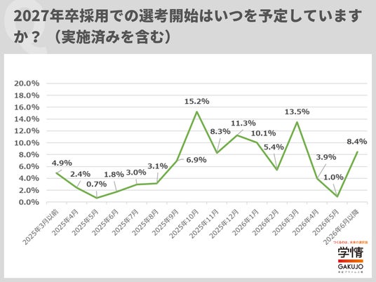 (3)2027年卒の選考開始は「2025年10月」「2026年3月」が2つのピーク。「2025年内」は6割近くに