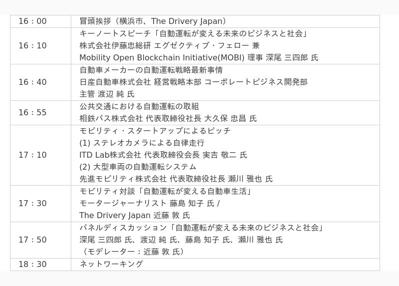 自動車産業に精通する深尾三四郎氏、自動車ジャーナリスト兼レーサーの藤島知子氏のほか、日産自動車株式会社や相鉄バス株式会社、自動運転技術の開発を行うスタートアップなど、最先端のモビリティ・イノベーションに取り組む市内企業の皆さんにご登壇いただき、自動運転に関する最新事情や本音のお話を伺います。
