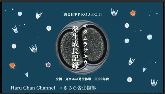 お茶の水女子大学湾岸生物教育研究所は2022年10月から2023年1月にかけて、全国の学校・ご家庭・市民サークルなどに同じウニ由来の卵精子教材を一斉発送して発生実験を同時期に行ってもらいました。また、実験と同時並行でオンライン相談会・報告会や冬休みのオンライン表現作品コンテストを実施し、利用者同士が相互に繋がりながら海やウニを学ぶイベント「全国一斉ウニの発生体験2022年秋」を開催いたしました。これは学校で海洋教育の授業を行うための教材提供と、一般を対象とした体験イベントとを融合させたイベントであり、10月はキタムラサキウニ、11月はアカウニを用いて実験を行いました。