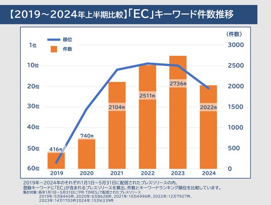 2023年:10位(2736件)、2022年:9位(2511件)とTOP10常連であった「EC」です。コロナ禍に実店舗で販売が難しくなった食品や飲食店がECに活路を見出して2020年以降で発表が増えました。しかし、2024年上半期は21位(2022件)と大きく順位を落としました。総合ランキングでも言及したように、「旅行」「観光」といったリアルなお出かけが可能になったことで、落ち着いた影響と考えられます。一方で、「DX」のようにその有益さから引き続き活用されることが予想されます。