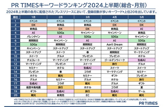 「PR TIMES」ではプレスリリース発表の際に、発表企業がプレスリリース内容に関係するキーワードを最大10個登録することができます。2024年1~5月に発表された総計15万6339件のプレスリリースのキーワード登録総数は24万3251種に上りました。総合ランキングでは2024年の企業活動の潮流を、そして月別ランキング推移からは企業動向の変遷と流行の兆しをキーワードを通して分析しています。