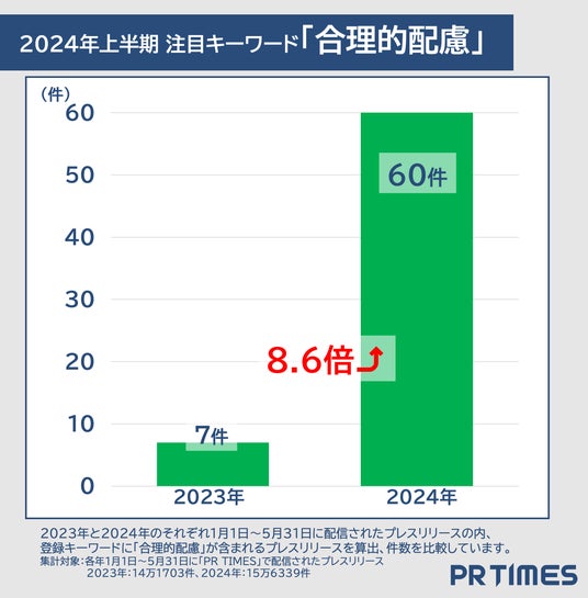 今年の4月1日から事業者による障害のある人への合理的配慮の提供が義務化されました。各社から関連サービスの提供や導入など、これに合わせた事業活動の発表が増えています。2024年上半期には60件の発表があり、前年同期(7件)から8倍超増えており、今後さらに発表が増えることが予想されます。