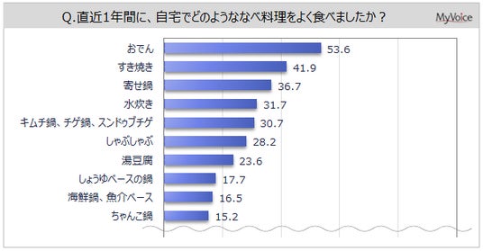 直近1年間に自宅でよく食べたなべ料理は(複数回答)、「おでん」が53.6%、「すき焼き」が41.9%、「寄せ鍋」「水炊き」「キムチ鍋、チゲ鍋、スンドゥブチゲ」が各30%台、「しゃぶしゃぶ」「湯豆腐」が約20%台です。