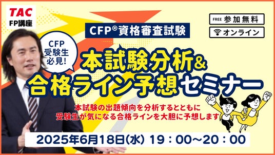 ファイナンシャル・プランナー(以下、FP)、簿記検定試験、税理士、公認会計士などの資格取得に向けた教育サービスを展開しているTAC株式会社(東京都千代田区、代表取締役社長:多田 敏男)は、6/8(日)・6/15(日)実施の2025年度第1回CFP(R)資格審査試験の「本試験分析&合格ライン予想セミナー」を6/18(水)に実施します。受験生はもちろん、これからCFP(R)への挑戦を検討中の方も参加可能です。ベテラン講師の徹底分析が聞けるセミナーは資格学校TACならでは。簡単に参加登録できますので、お気軽にご参加ください。