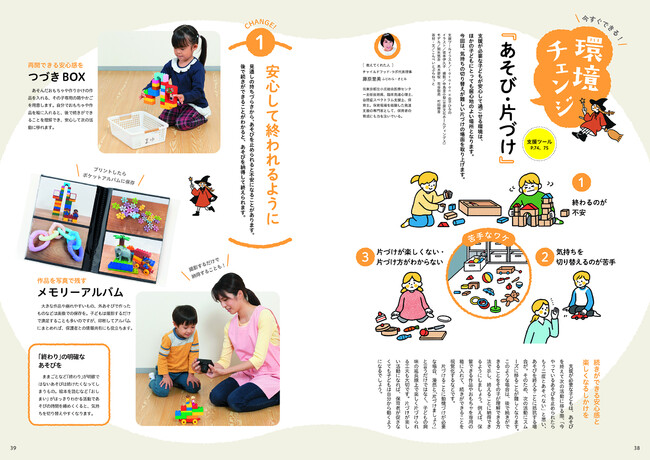 発達に課題のある子のなかには、あそびを終える、片づけをするなど、“切り替え”が苦手な子が少なくありません。今号では、後で続きができるという見通しや安心感を与える工夫、片づけが楽しくなる演出やしかけをご紹介。活動が終わるごとに楽しみながらシールを貼ることで切り替えられるようになるカードなど、コピーやダウンロードして使える素材つき!