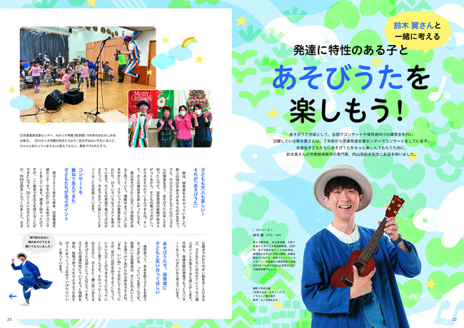 元保育者であり、あそびうた作家として全国で親子コンサートや保育者向けの講習会を行っている鈴木翼さん。今号では、7年前から児童発達支援センターでもコンサートをしているという鈴木翼さんが、児童精神科医の内山登紀夫先生に、発達に特性のある子とあそびうたを楽しむポイントを伺いました。また、子どもが夢中になる鈴木翼さんのとっておきのあそびうた2曲を楽譜つきでご紹介!