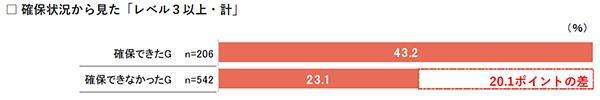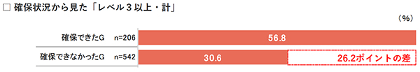 ■DX人材の確保ができなかったグループ(少ない・計)は、「取り組みが行われていない」が17.5%と、確保できたグループの9.2%より高い。レベル3以上を見ると、確保できたグループは56.8%と半数以上であるのに対して、確保できなかったグループは30.6%と大きく下回っている。
