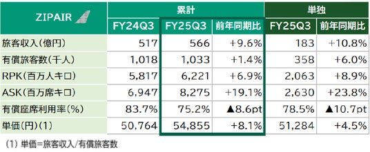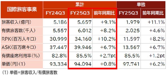好調なインバウンド需要と緩やかに回復する日本発のビジネス需要を取り込み、Q3単独では旅客数と単価のいずれも堅調に推移しました。