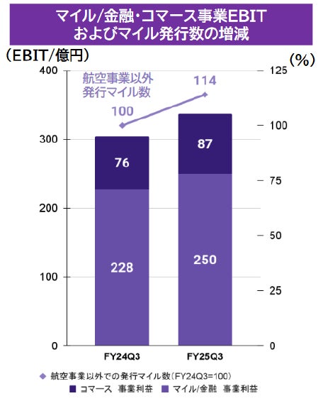 旅客数の増加に加え、JALカード決済額の増加に伴う発行マイル数の増加などにより、売上収益は前年比+10.4%の 1,668億円、EBITは前年比+11.2%の338億円となり、 安定的に利益を伸ばしています。