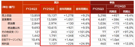 当第3四半期において、売上収益は前年比+9.2%の1兆5,137億円となりました。営業費用については、収入に連動する費用の増加や物価高、人的資本投資などにより、前年比+8.4%の1兆3,589億円となりました。