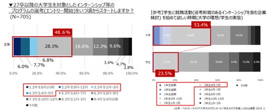以上のことから、インターンシップ等のプログラムの選考時期が「3年生4-5月」であるとの認識は、企業と大学でほぼ一致しているものと捉えられる。