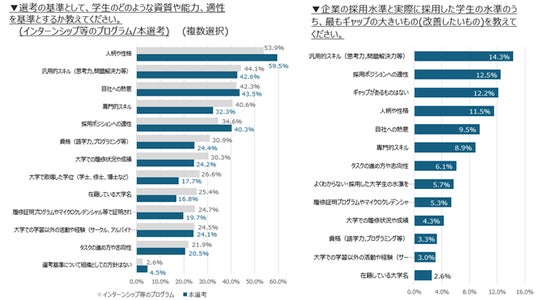 企業の「選考基準」と、大学の「学生を評価して欲しい項目」についても一致しており、以前から重視されている「人柄・性格(59.5%)」や「自社への熱意(43.5%)」に加え、「汎用的スキル(42.6%)」が上位に挙げられた。