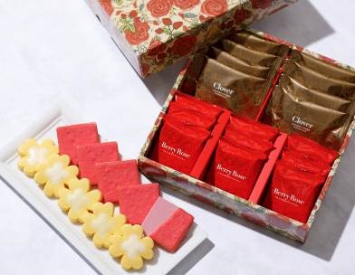 レモン風味のショコラと、オレンジフラワーのエッセンスを加えたショコラをあわせ、ほろりととろける食感に焼き上げたベイクドショコラとバラの花びらを混ぜ込んだクッキーに苺とバラ風味のチョコレートをサンドしたラングドシャを詰め合わせました。