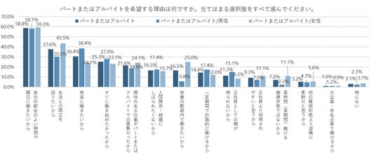 求人に応募した、パートまたはアルバイトを希望する人に、なぜその雇用形態を希望するのかを聞いた(複数回答)。最も多かったのは「自分の都合のよい時間や曜日に働きたいから」で58.8%、次いで「生活との両立を図りたいから」が37.6%、「気楽に働きたいから」が30.4%となった。