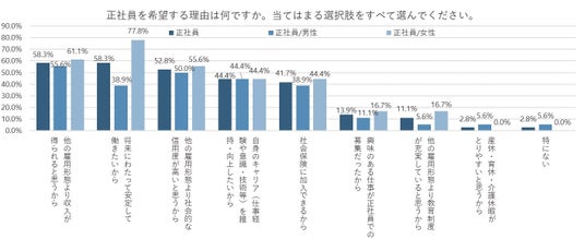 「他の雇用形態より収入が得られると思うから」「将来にわたって安定して働きたいから」が同率最多の58.3%
