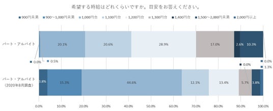 2020年8月調査時と比較すると希望時給が上昇しており、最低賃金上昇の影響がみられる。