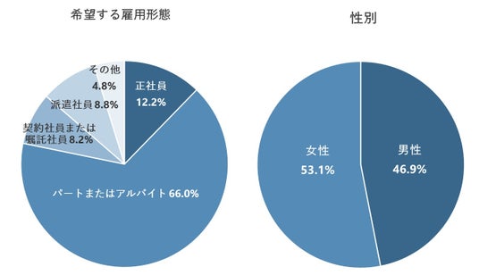 一方、「女性」のほうが「男性」よりも「扶養の範囲内で働きたいから」が19.2pt、「生活との両立を図りたいから」が13.3pt、「長時間(長期間)働ける健康状態ではないから」が8.8pt高くなった。家庭の仕事との兼ね合いでパートタイムを希望していたり、収入に目安を設けて仕事をしたい人が男性よりも多いことがわかる。