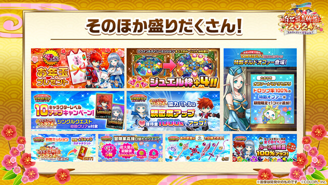 「~今年は白猫10周年~ 10周年目 突入!記念キャンペーン」を実施しております。毎日最大100回分ガチャれるチャンスがある「新春ガチャチケおみくじ」や、ジュエルが51個もらえる「お年玉プレゼントクエスト」などの10個に及ぶ「10大記念キャンペーン」を開催しております。さらに、対象のクエストで「親密度1000%にアップ!」「キャラクターレベル10アップ!」「冒険家応援日替わりクエスト」など、様々なキャンペーンを開催しております。その他のキャンペーン詳細は、2024年1月1日(月)公開の「おせニャん」およびゲーム内お知らせをご確認ください。