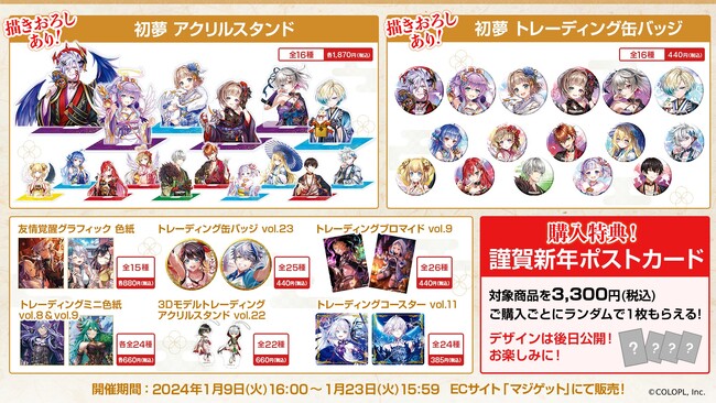 ECサイト「マジゲット」内にある「コロプラ公式ショップ」にてお正月をテーマにした『白猫』グッズフェアを2024年1月9日(火)16:00より開始いたします。描きおろし衣装を着たキャラクターたちの最新グッズが登場します。商品を税込3,300円毎のご購入で、キャラクターからのメッセージ付きポストカードをランダムで1枚プレゼントいたします。