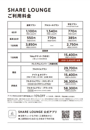 「SHARE LOUNGE」公式アプリをお持ちのお客様は、利用日の2週間前(利用日の14日前)から、利用開始時間の15分前までご予約いただけます。また、お手持ちのクレジットカードをアプリにご登録のうえアプリからご予約いただくと、店頭に設置されている専用端末にQRコードをかざすだけでチェックイン、チェックアウト、お会計ができます。(お会計はチェックアウトの際に、クレジットカードで自動決済されます。)なお、ドロップイン・チケット購入の場合は、PayPayでもお支払いいただけます。(すでにクレジットカードをご登録いただいているお客様は、一度、クレジットカード情報の削除が必要になります。プレミアム月額料金決済にはご利用いただけません。)