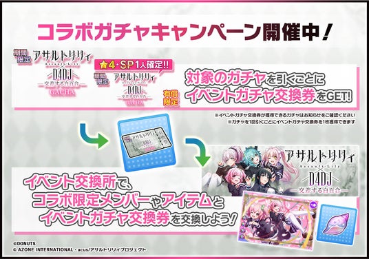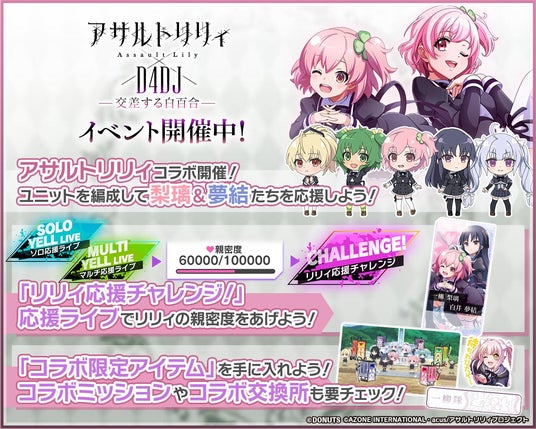 株式会社DONUTS(本社:東京都渋谷区、代表取締役:西村啓成)は、スマートフォン向けリズムゲーム「D4DJ Groovy Mix」(以下グルミク)にて、『アサルトリリィ』とのコラボイベント&ガチャ「アサルトリリィ×D4DJ Groovy Mix -交差する白百合-」を9月12日(木)12:00より開始いたしました。