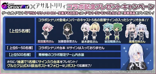 コラボイベント「アサルトリリィ×D4DJ Groovy Mix -交差する白百合-」のイベントランキング上位者に、コラボシナリオ台本やゲーム内衣装などの豪華景品をプレゼント!