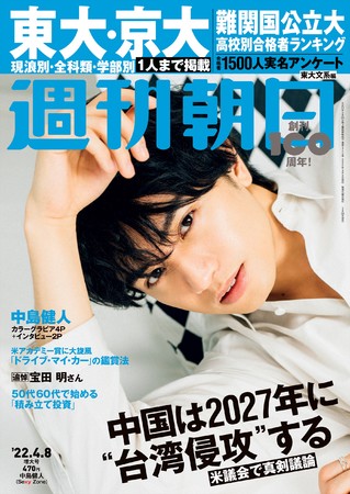 今週の「週刊朝日」は、Sexy Zoneの中島健人さんが表紙とカラーグラビアを飾ります。主演のNetflix映画「桜のような僕の恋人」は、ジャニーズが誇る“キラキラ王子様”な中島さんはどこへ行ったのかと思わせるような冴えなさ漂う見習いカメラマンと、急激に老化が進む難病を患う女性の儚ないラブストーリー。かねて原作の大ファンだった中島さんが、アイドルとしての自分をかなぐり捨ててたどり着いた新境地とは……インタビューでじっくり語っていただきました。他にも、「中国が2027年に台湾に侵攻する」という衝撃的な説の検証記事、東大・京大合格者1500人の実名アンケート、50代、60代からでも始められる「積み立て投資」、米アカデミー賞で日本映画史上初となる作品賞とあわせて4部門でノミネートされ、国際長編映画賞受賞という快挙を達成した「ドライブ・マイ・カー」の魅力など、充実のラインナップでお届けします。