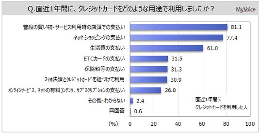 直近1年間にクレジットカードを利用した人の用途は(複数回答)、「普段の買い物・サービス利用時の店頭での支払い」が81.1%、「ネットショッピングの支払い」が77.4%、「生活費の支払い」が61.0%です。