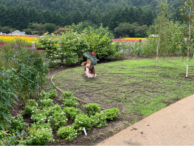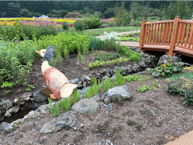 イングリッシュガーデンのデザイン監修はイギリス人ガーデンデザイナーのマーク・チャップマン氏が手掛けており、春から初冬にかけて約300種類の草木や花々が咲き誇ります。4月~5月は、大輪の濃いブルーの花をたくさん咲かせる「プルモナリア ‘ブルー エンサイン’」や、ライトピンクの美しい花を咲かせたあとに赤い実をつける「桃花イチゴ」、花穂が富士山の形に似ていることから「ふじさんアジサイ」と呼ばれる山梨県産のアジサイなどの草花を鑑賞することができます。庭園内の代表的な約100種類の草花に添えられた「花名板」のQRコードから品種や開花時期、お花の特徴、花言葉などの詳細情報を確認することができます。また園内には、富士山とピーターを一緒に撮影することができるスポットをはじめ、キャラクターたちのフォトスポットがあります。