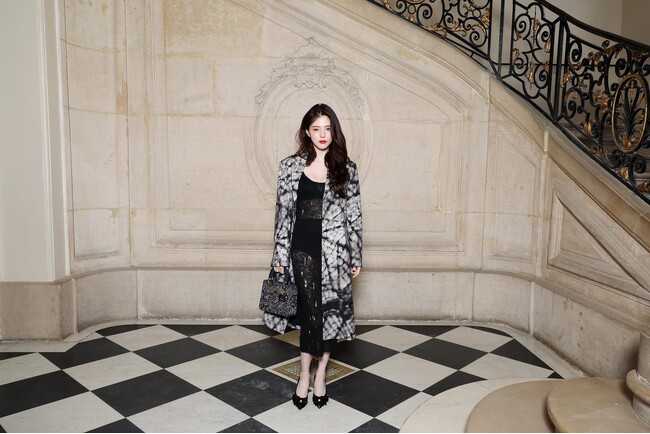 ハン・ソヒは2024年春夏 ウィメンズ コレクションより、「プラン ドゥ パリ」プリントのコートをブラックのニットトップスとスカートの上に羽織り、バッグとシューズを合わせた装いで登場しました。