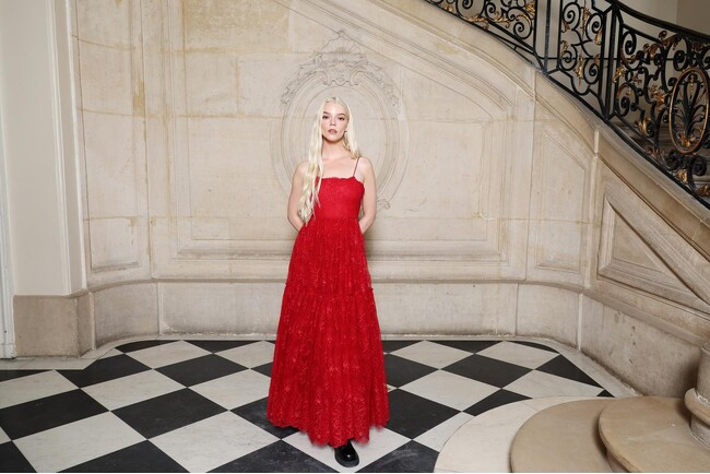 アニャ・テイラー=ジョイは華やかなロングのレッドレースドレスにブラックのシューズを合わせました。