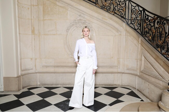 エリザベス・デビッキは、2024年春夏 ウィメンズ コレクションより、アシンメトリーのホワイトシャツとコットンのホワイトパンツ、シューズを合わせています。また、ディオール ファイン ジュエリーより「ボワ ドゥ ローズ」のイヤカフとブレスレットを纏いました。