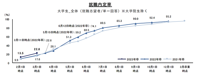 3月1日時点の大学生(大学院生除く)の就職内定率※1は、22.6%(+5.0ポイント)※2と、3月広報解禁となった2016年卒以降、前月に引き続き過去最高となりました。内定を得ている業種としては、「情報通信業」が最も高く33.6%(+6.1ポイント)で、前年からの増加幅も最も大きくなっています。また、従業員規模別で見ると、最も高いのは「1,000人~4,999人」ですが、300人未満規模の企業で前年からの増加が目立ちます。内定率の増加の一方で、内定辞退率は18.6%(+1.9ポイント)と、例年同水準です。2022年卒の内定辞退率の推移を見ると、4月中の伸び幅が特に大きくなっています。加えて、『就職白書2022』の企業の「2023年卒の採用プロセス開始予定時期」を見ると、内定出し開始の割合が最も高いのは、2022年卒が4月、2023年卒が3月となっており、内定出し開始のピークが前倒しとなっている様子がうかがえます。これらのことから、内定辞退・選考辞退が前年と比べ、3月中により多く発生することが予想されます。内定出し開始のピークは3月ではありますが、今後も企業は選考活動を続けていきます。学生の皆さんは、周りに流されることなく、納得できる進路を自分で選択するための活動が重要です。自ら情報を取りにいき、企業との対話を重ねることで、自身の考えや仕事の理解を深めていきましょう。