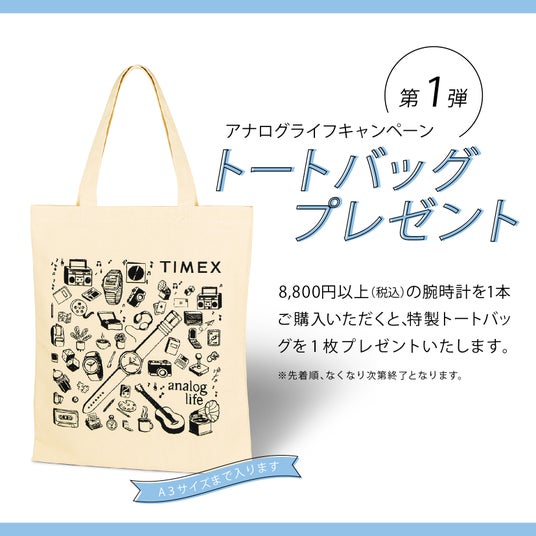 株式会社ウエニ貿易(本社:東京都台東区、代表取締役社長:宮上光喜)が日本総代理店を務める「TIMEX(タイメックス)」は、アナログライフキャンペーン第1弾として特製トートバッグをプレゼントするキャンペーンを6月21日(金)より開始します。