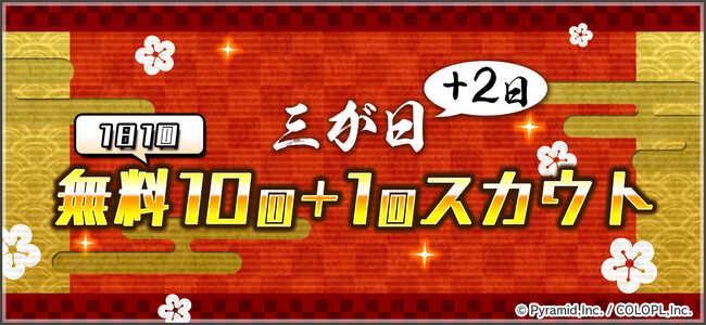 2024年1月1日(月)0:00より、無料スカウトが毎日行える「三が日+二日 無料10回+1回スカウト」や、★4キャラが確定入手できる各種「★4キャラ1人確定スカウト」の開催など、様々な「お正月アップデート」をゲーム内にて開催しております。