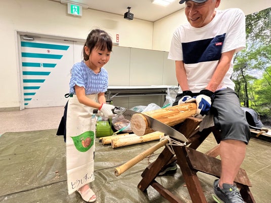 水源林の間伐材を使った丸太切り体験、木工体験をお楽しみいただけます。