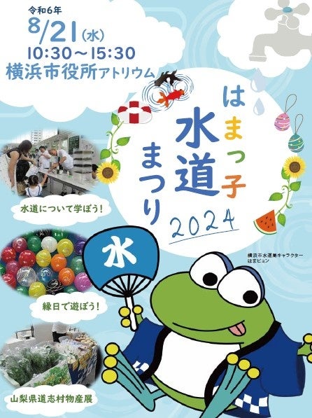 8月21日(水)横浜市役所アトリウムにて、横浜の水道について大人も子どもも楽しみながら学べるイベント「はまっ子水道まつり2024」を開催します。当日は、ろ過実験や丸太切り体験、縁日、キャラクターグリーティングなどをお楽しみいただけます。ぜひお越しください!