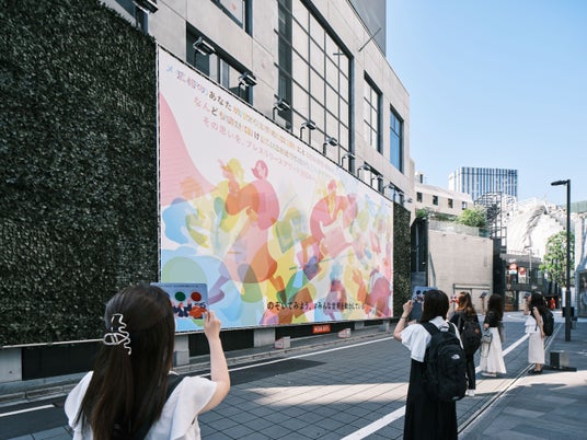 東京・渋谷に7月22日(月)から8月4日(日)まで掲出、3色のフィルターメガネを配布。古舘伊知郎さんの実況ガイドも