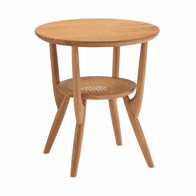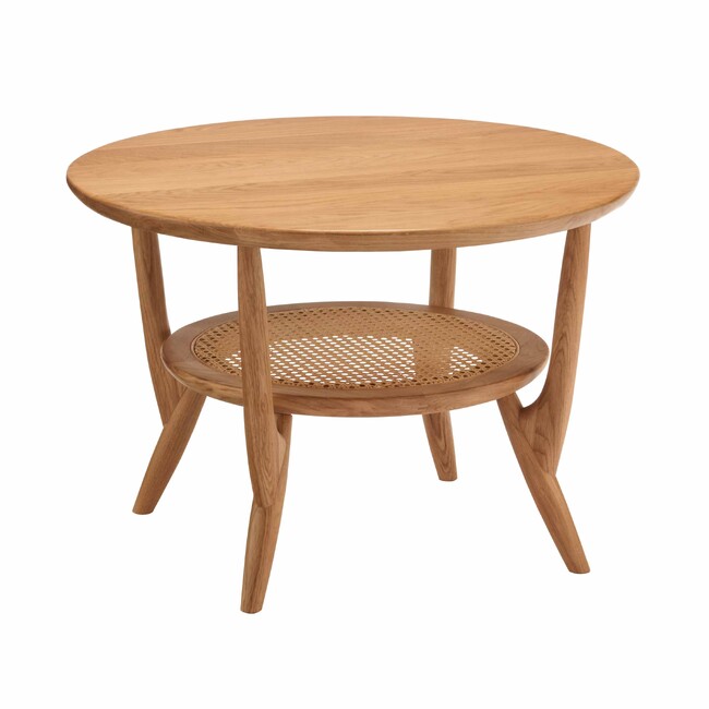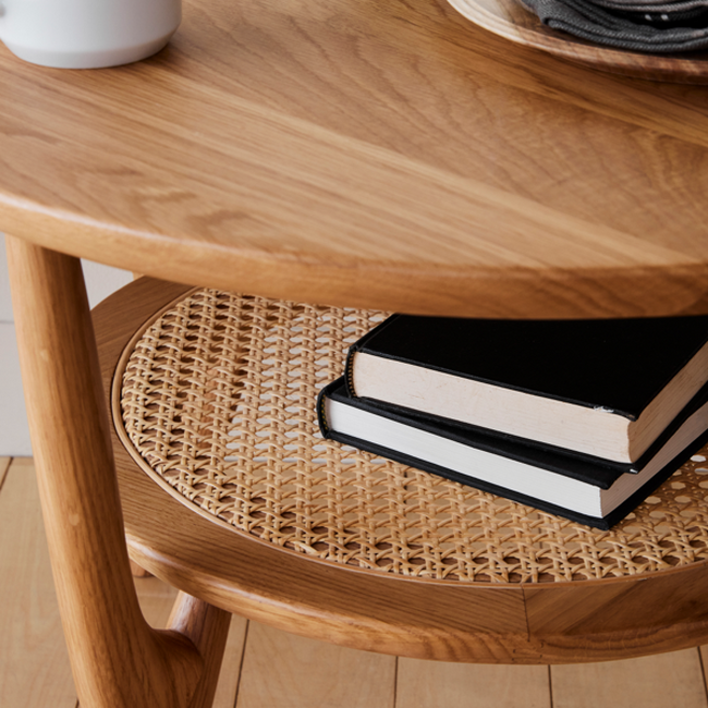 中世の修道院が持つ厳粛で慎み深い雰囲気、純真さなどを表現するために、テーブルの本体にはオーク無垢材を、棚板には伝統工芸の技術を使った「籠目(カゴメ)格子」(ケインメッシュ)を採用しました。籐(ラタン)で編まれた格子状の棚板は、強度があり軽量で使い勝手のよさを実現しています。また、テーブルの脚に高度な細工を施すことによって、強度を高めています。