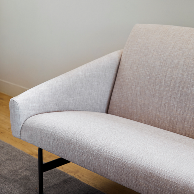 座面と背もたれの角度を大きくとり、傾斜させることで、体の収まりがよく、包み込まれるような座り心地のソファです。また、くつろいで座った姿勢からでも立ち上がりやすいように、体の動きを考え、手をかけて立ち上がるのに最適なアームの角度に設計しています。