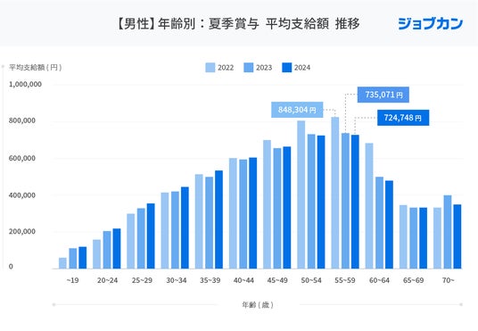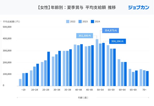 年齢別に夏季賞与平均支給額の推移を見ると、支給額が最大値になるのは50歳台で、2022年「648,301円(50~54歳)」2023年「564,718円(55~59歳)」2024年「565,658円(50~54歳)」となり、50歳台までは年齢を重ねるごとに支給額も高くなっていく傾向が現れました。