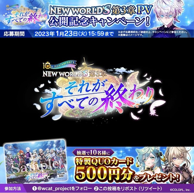 株式会社コロプラ(代表取締役社長:宮本貴志、本社:東京都港区、以下「コロプラ」)は、スマートフォン向け本格3DアクションRPG『白猫プロジェクト NEW WORLD'S(以下、『白猫』)』において、「第3章 ~それがすべての終わり~」を1月19日(金)より開幕したことをお知らせいたします。