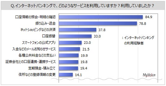 インターネットバンキングで利用するサービスは(複数回答)、「口座情報の照会・明細の確認」が利用経験者の84.9%、「振り込み・送金」が78.8%、「ネットショッピングなどの決済」「口座振替」が各30%台です。