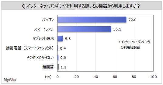 インターネットバンキングを利用する機器は(複数回答)、「パソコン」が利用経験者の72.0%、「スマートフォン」が56.1%です。