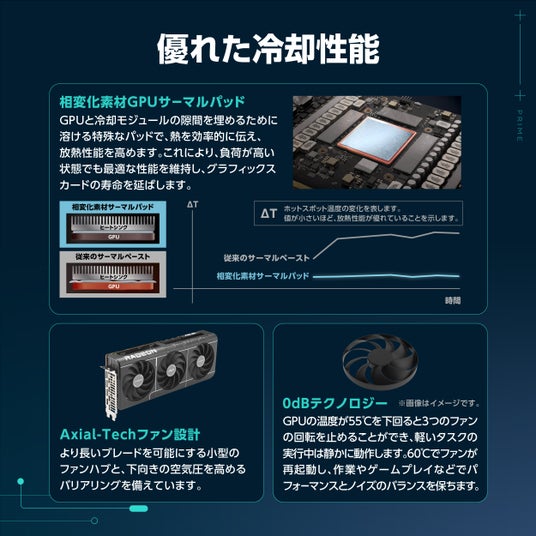 GPU温度が55°C未満でファン停止、60°C以上で再起動し、性能と静音を両立。
