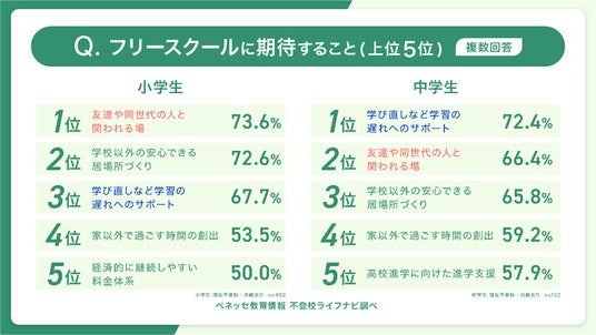 株式会社ベネッセコーポレーション(本社:岡山県岡山市、代表取締役会長兼社長:岩瀬大輔、以下:ベネッセ)が運営する、不登校に関わるご家族やお子さま向け情報発信サイト「不登校ライフナビ」は、ベネッセの保護者向けアプリ「まなびの手帳」に登録されている小中学生の保護者2,116名、不登校ライフナビに登録されている小中学生の保護者124名、計2,240名を対象に、「不登校・フリースクールに関する意識調査」を実施しました。
