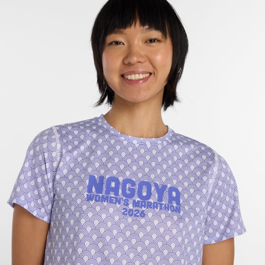 「名古屋ウィメンズマラソン2026」限定のショートスリーブTシャツ。和を意識した小紋柄のオールオーバープリントと、胸元の大会ロゴがデザインポイント。通気性に優れたストライプメッシュと、前後差のあるサイドスリットが快適な走りをサポート。大会を華やかに演出する一枚。