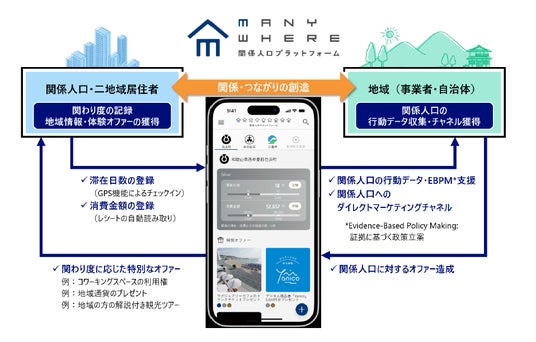 NRIデジタルが開発している関係人口プラットフォームアプリ「MANYWHERE」では、「関係人口の可視化」に向けて、二地域居住者と自治体や事業者の双方をつなぐサービスを実現します。二地域居住者は、自身の滞在履歴を記録できるだけでなく、アプリを介して、その地域との関わり度合に応じた特別な地域体験オファーを得ることができます。自治体や事業者にとっても、アプリ登録者の関与・活動状況をデータで把握することができるため、地域に関わる人々に向けたサービスのさらなる改善につなげていくことが可能です。