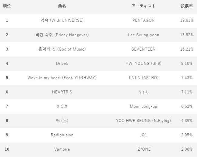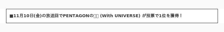 『IDOL CHAMP presents POP-K TOP10 Friday』11月10日(金)の放送回において、PENTAGONの약속 (With UNIVERSE)が、チャート投票で1位を獲得し、今週のNo.1曲として番組内で放送されました。