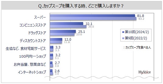 カップスープを食べる人の購入場所は(複数回答)、「スーパー」が81.8%、「コンビニエンスストア」が32.1%、「ドラッグストア」が25.1%です。